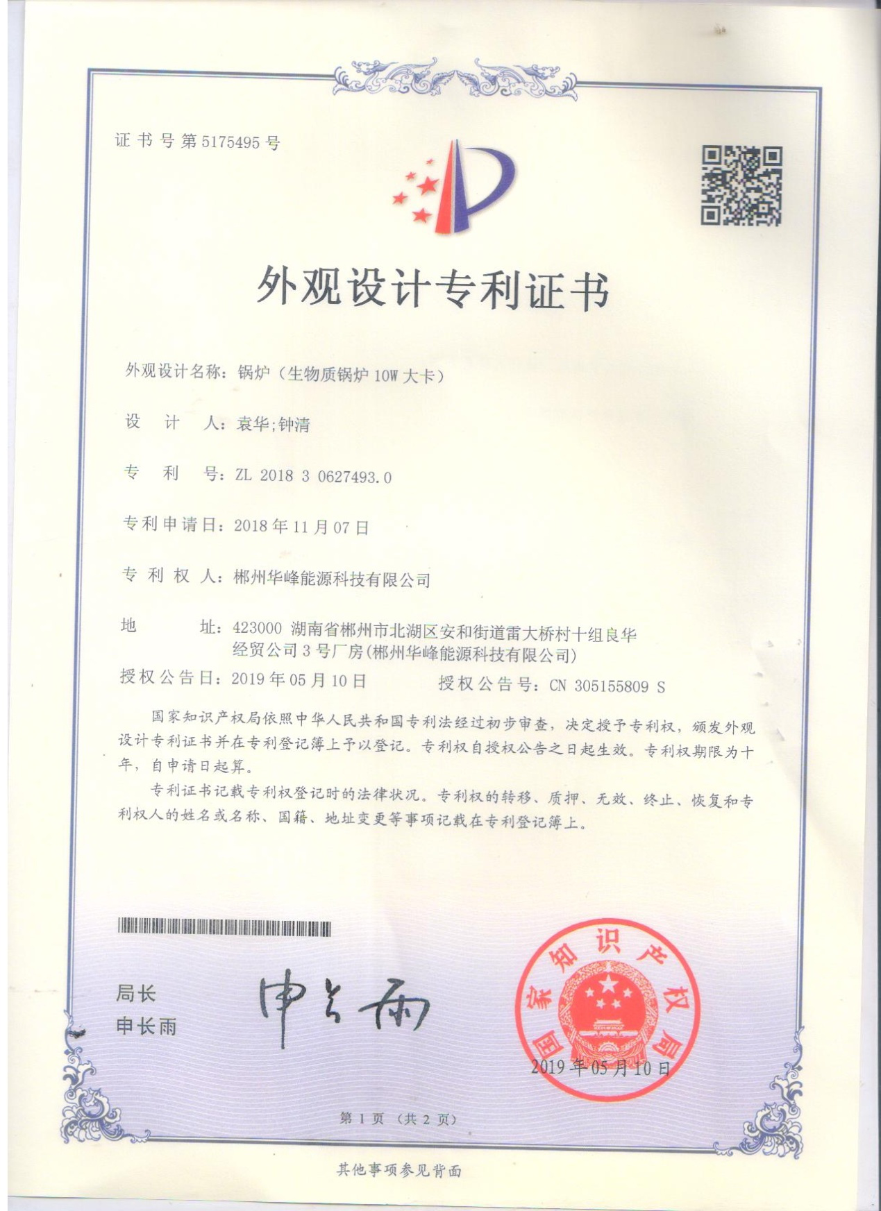 外觀設(shè)計專利證書